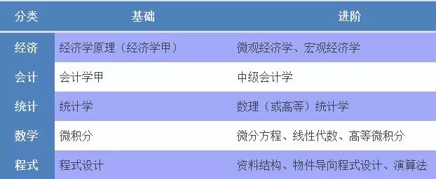 经济的部分,基础的当然就是大一的经济学,经济学原理或经济学甲;比较进阶的部分就是经济系开的,大二的微观经济学跟宏观经济学。会计的话就是会计学跟中级会计学。统计学部的话,在初阶的部分就是不需要微积分的统计,就是你们一般学的课名叫统计学的那种课;进阶的话就是需要以微积分为基础的统计,像数理统计学和高等统计学这个部分。数学的话比较基础的就是微积分和线性代数,比较深的话就是微分方程和高等微积分;程式……一开始的话,你可以学程式设计和物件导向程式设计(C++或Java),这样子的话你就会写程式了,但如果你想要写出好的、有品质的、不是土法炼钢的那种程式,你就要学资料结构和演算法。不过我这里虽然列出五大类,还包括初级跟中级,不是要你全部都学会。